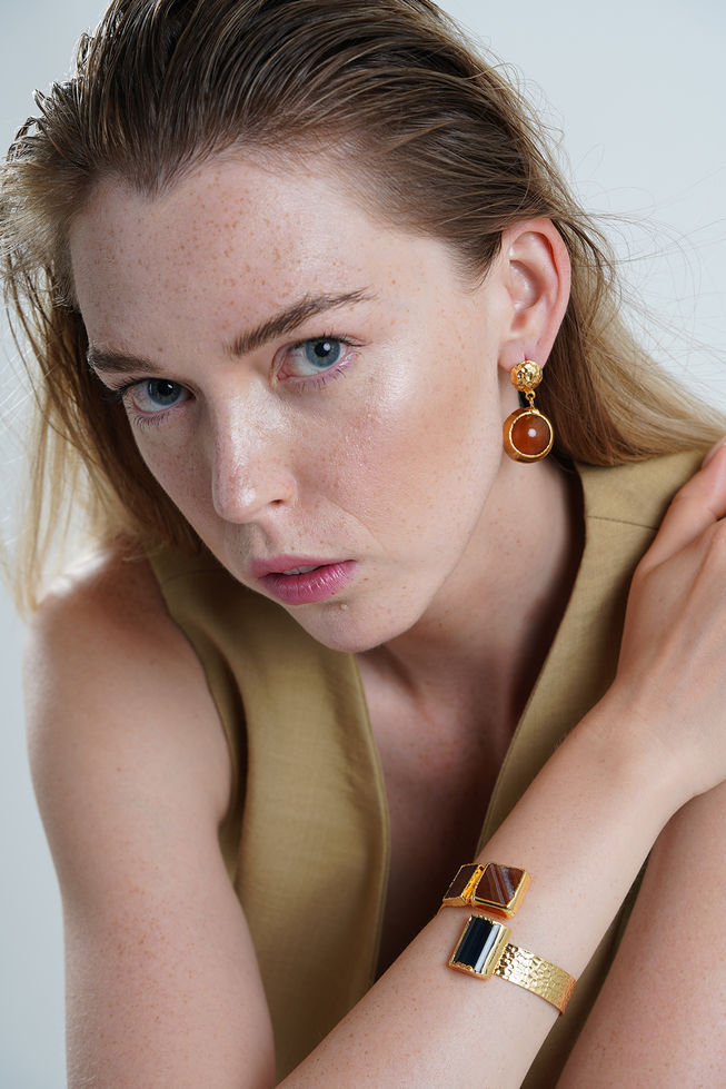 Gece ve Gün Doğumu Bileziği, gece ile gündüzün büyüleyici karşılaşmasını bileğinizde taşır. Pirinç üzerine altın kaplama ile tasarlanan bu bilezik, siyah oniksin gizemli karanlığını ve agat taşının sıcak, yumuşak tonlarını bir araya getiriyor. Bu bilezik, hem günlük kullanımda hem de özel anlarda tarzınızı tamamlayacak benzersiz bir aksesuardır.